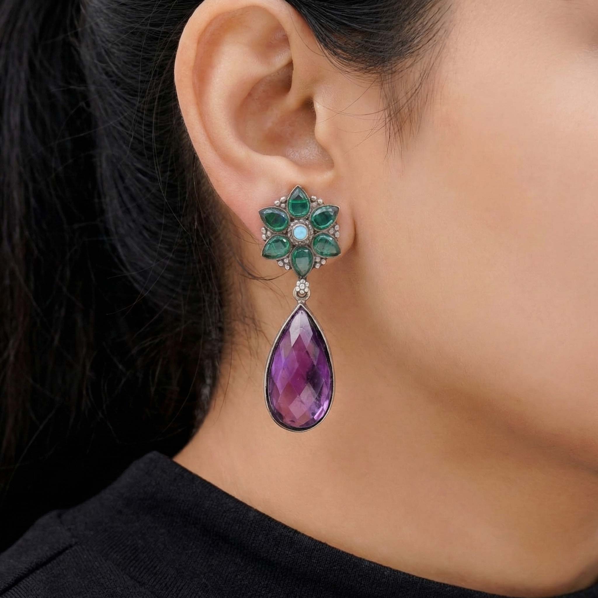 The Green Kamal Drops are a stylish addition to any wardrobe, crafted with 92.5 Silver and oxidation for a beautiful finish. The intricate detailing of Semi Precious Stone adds a Festive wear flair that is perfect for any office or special occasion.