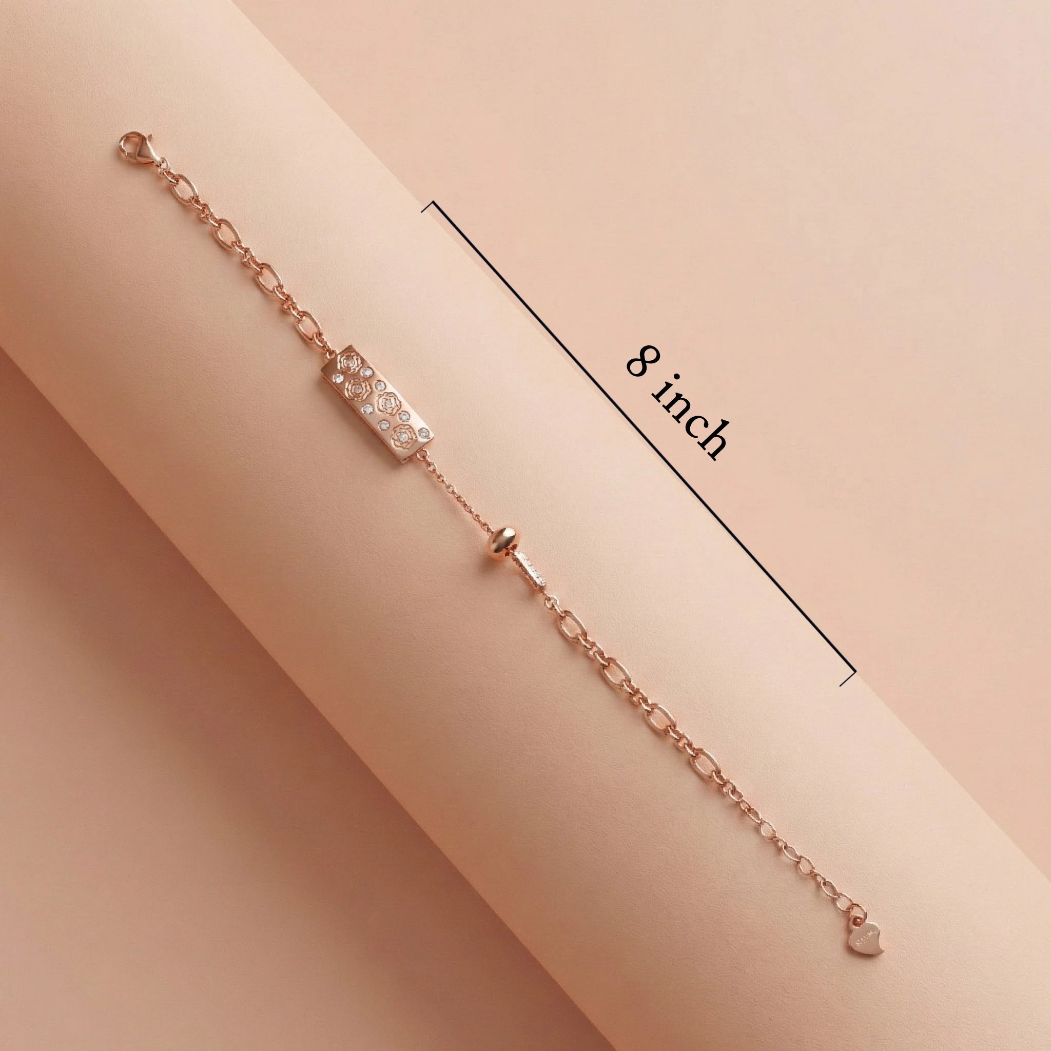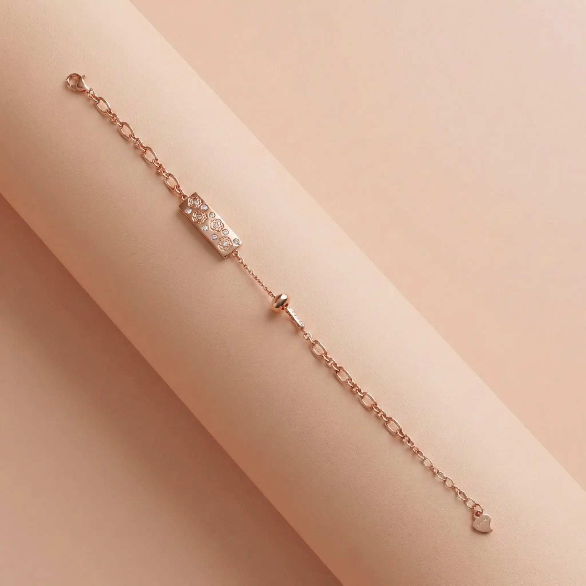 Timeless romance on your wrist. This exquisite bracelet is crafted from 92.5 Sterling Silver with a glowing rose gold polish. The focal point is a sleek rectangular bar, beautifully engraved with a row of delicate roses. Each flower is centered with a tiny sparkling crystal, adding just the right amount of shine. Finished with a delicate link chain and a sweet heart tag on the extender, it’s a perfect gift for someone special.